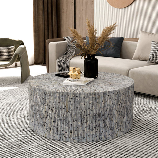 Low stockLAYLA TURQUOISE COFFEE TABLE Adorned with discs of real sea shells that shimmer when they catch the light, our Layla coffee table will instantly br...