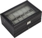 Black Leather Watch Box Jewelry Display Case with Drawers (12 Slots with 2 Layers)