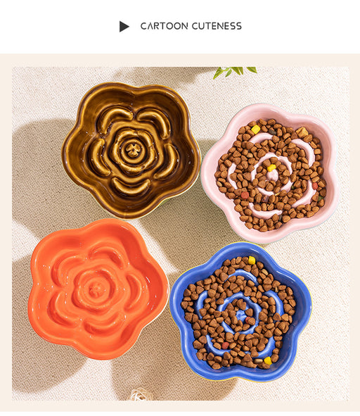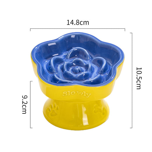 Yellow and Blue Ceramic Slow Feeder Pet Bowl for Cats and Small Dogs - Anti-Choke Elevated Design with 15-Degree Tilted Rim
